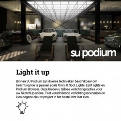 • SU Podium Browser: bibliotheek met extra 3D lichtarmaturen, hoge resolutie materialen en render-klare Podium objecten zoals meubels, auto's, bomen, planten en mensen. Sleep materialen objecten en materialen direct in uw SketchUp model en kleed nog sneller uw scene aan.
