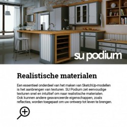 SU Podium maakt gebruik van verschillende eigenschappen uit het SketchUp model, zoals de texturen, (achtergrond)kleuren, geometrie en schaduwvallen. Zo hoeft u deze niet eerst apart in te stellen. Zodra u een materiaal in SketchUp heeft geselecteerd, kunt u deze bewerken met reflectie, refractie, reliëf en lichtsterkte. SU Podium beschikt ook over diverse belichtingsopties, zoals lichtpunten, lichtspots en zonlicht. Maakt u gebruik van de materialen en objecten uit Podium Browser (de render-klare bibliotheek voor SU Podium)? Dan bent u vrijwel direct klaar voor een mooi eindresultaat.